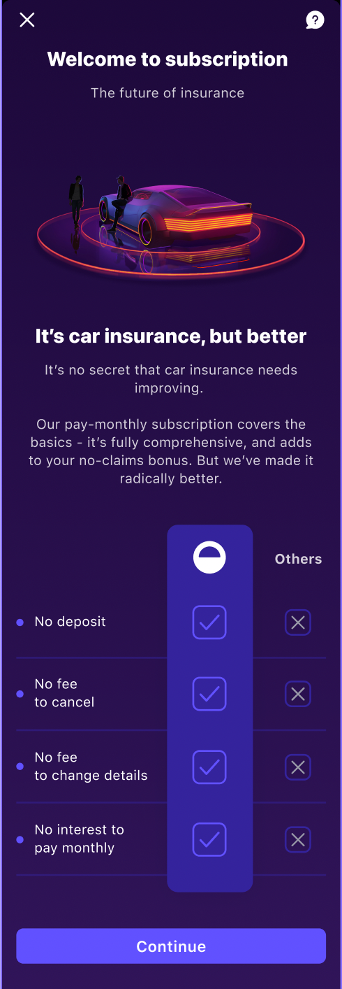 BACKGROUND: We created a new, game-changing monthly car insurance product that replaces annual cover. But whenever a company disrupts an industry, they also disrupt user expectations around how the products and services work. This creates a degree of friction within the product experience that you need to remove, or risk drop-off.